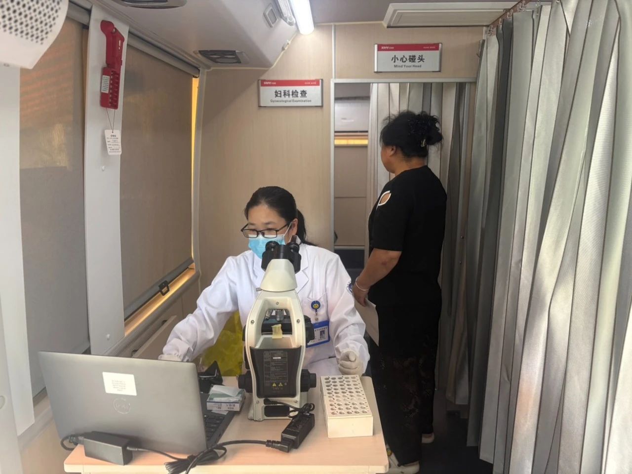 這輛裝備精良、功能齊全的“兩癌篩查車”穩(wěn)穩(wěn)??吭谖餍麓宕逦瘯T口。它麻雀雖小,五臟俱全,車內(nèi)配備了先進(jìn)的乳腺彩超、婦科檢查床、HPV采樣等專業(yè)